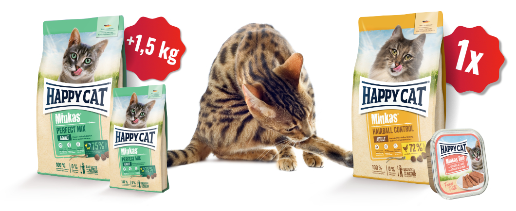 K jednomu kusu Happy Cat Minkas 10 kg nyní získáte 1,5 kg stejného balení krmiva navíc. K jednomu kusu Happy Cat Minkas 4 kg nyní získáte 1x Minkas Duo paštiku navíc.