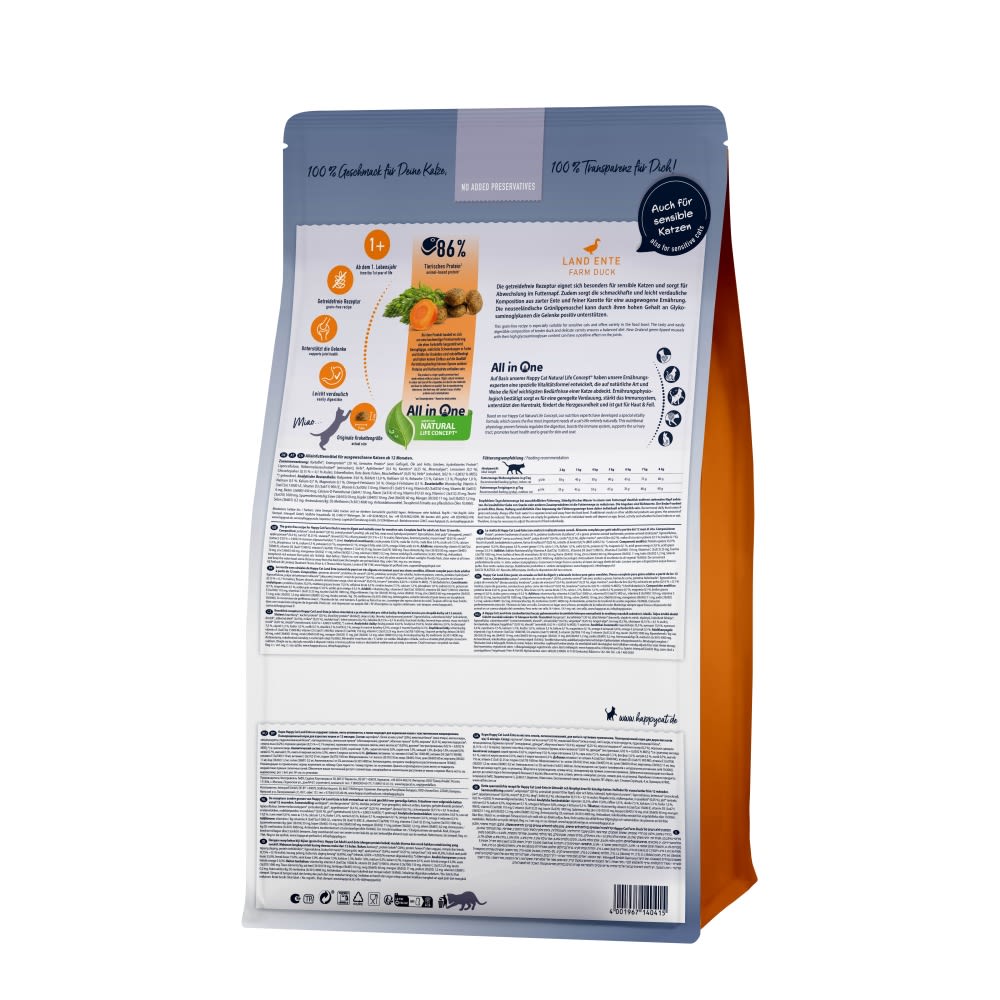 Některé kočky reagují alergicky nebo intolerancí na obiloviny v krmivu. Vaše domácí kočka si může bez obav vychutnávat suché krmivo pro kočky bez obilovin, jako je naše snadno stravitelné krmivo Happy Cat Culinary Adult Land-Ente.Složení krmiva Happy Cat Culinary Adult Land-Ente nabízí vaší kočce vše, co potřebuje pro přirozenou a druhově vhodnou stravu. Naše chutná receptura bez obilovin s křehkou kachnou a jemnou mrkví je snadno stravitelná a podporuje celkovou pohodu vašeho chlupatého přítele.