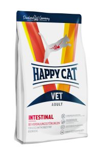 Krmivo Happy Cat VET Diet Intestinal se nasazuje ke zmírnění akutních střevních resorpčních poruch. Toto vysoce stravitelné krmivo se zvýšeným obsahem sodíku a draslíku se vyznačuje lehce stravitelnými zdroji komponentů, jako je kuřecí maso, rýže, drůbeží tuk a vejce.