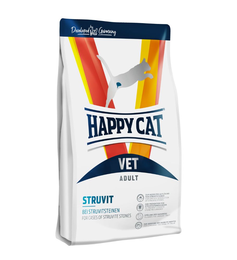 Happy Cat VET Diet Struvit se používá k rozpouštění struvitových kamenů a k omezení jejich opakované tvorby. Tato dieta je též vhodná pro kočky trpící kočičím urologickým syndromem (FUS). Toto dietní krmivo se vyznačuje obzvláště kvalitními bílkovinami, sníženým obsahem hořčíku a fosforu a schopností okyselovat moč, čímž se docílí významného snížení hodnot pH moči.