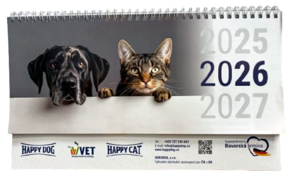 Krásný stolní kalendář na rok 2026, plný krásný fotografií psů a koček tématicky zpracováno dle zajímavých událostí v celém roce.