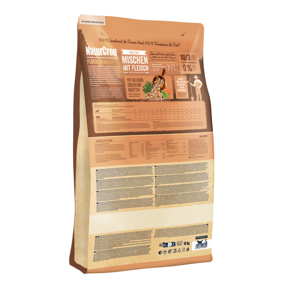 Doplňkové krmivo Happy Dog NaturCroq Flocken-Mixer obsahuje vysoce stravitelné šupinaté vločky, celozrnné vločky, zeleninu a bylinky a je obohaceno o všechny nezbytné vitamíny a minerály. Mrkev a hrášek poskytují důležitou vlákninu a obsahují také karoten a rostlinné bílkoviny. Náš příkrm NaturCroq Flocken-Mixer nabízí perfektní doplněk k jakémukoli masovému pokrmu a zajišťuje psům druhově vhodnou a vyváženou potravu s masem.