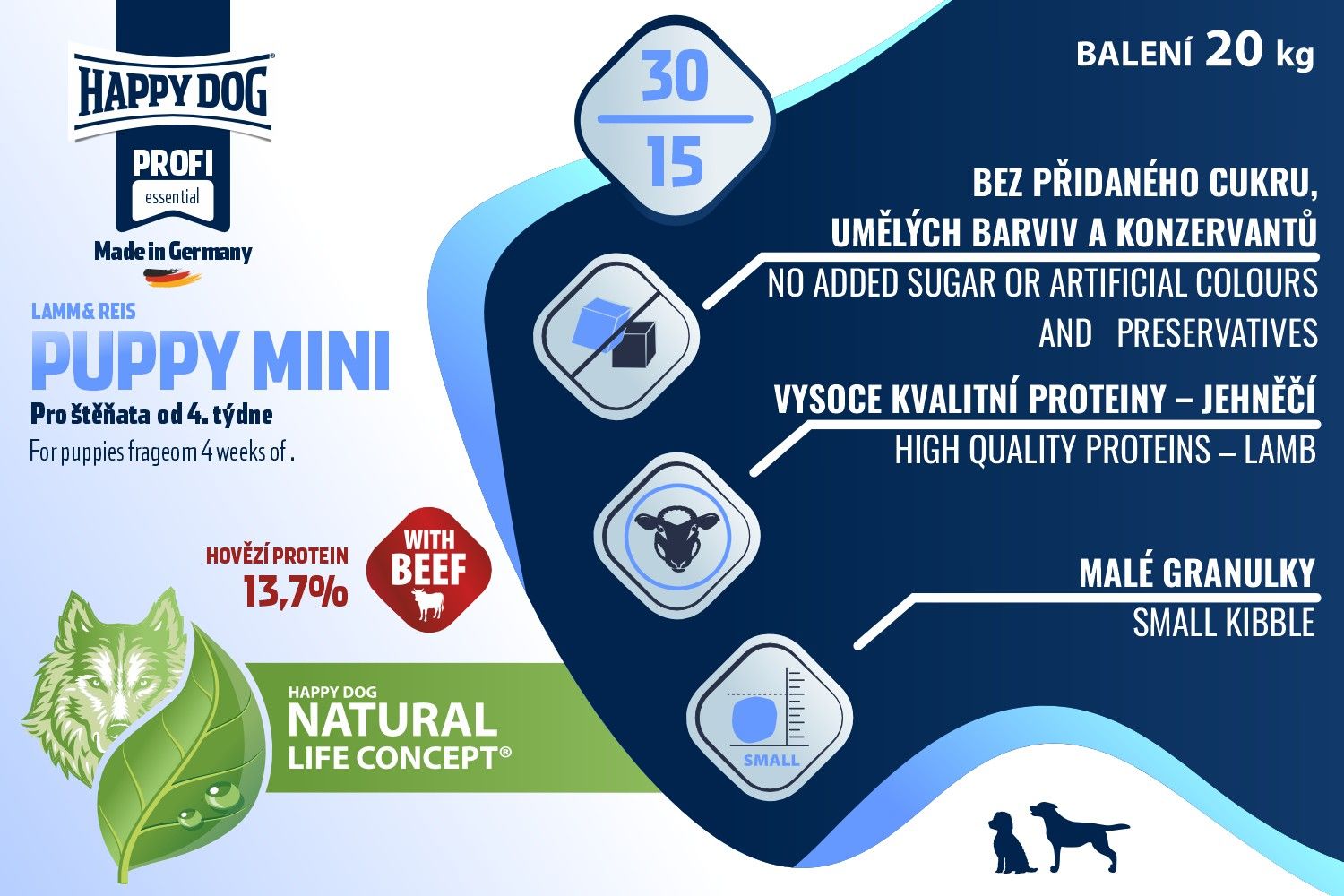 Dobře stravitelné jehněčí maso a lehce stravitelná rýže nezatěžují trávicí trakt vašeho malého štěňátka. Naše lahodné suché krmivo neobsahuje drůbeží maso a je ideálně stravitelné také pro malé pejsky s citlivým zažíváním. Přídavek cenných novozélandských mušlí podporuje harmonický růst a zdravý vývoj kostí, šlach, vazů a kloubů. Optimální poměr tuků a bílkovin dodá vašemu malému miláčkovi ideální množství důležitých živin. Díky přídavku Happy Dog Natural Life Concept® je vašemu štěněti poskytnuto vše, z čeho jeho organismus holisticky profituje, aby mohlo bez obav nastartovat dlouhý a zdravý psí život.